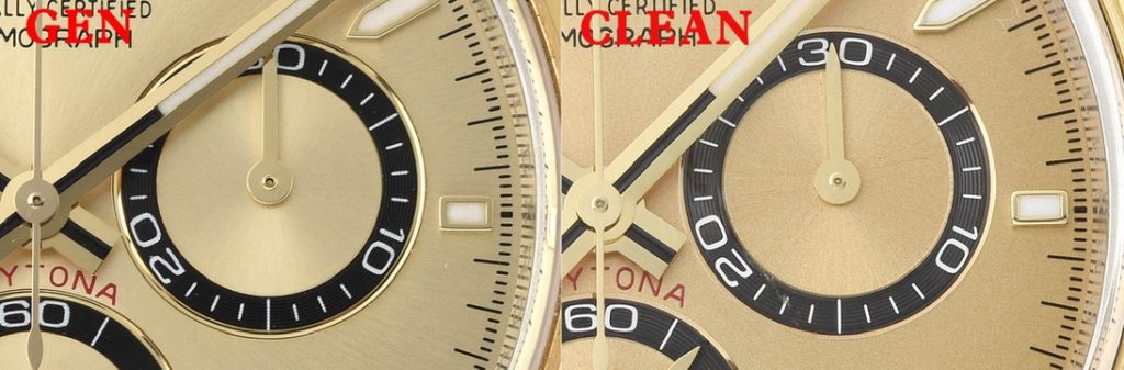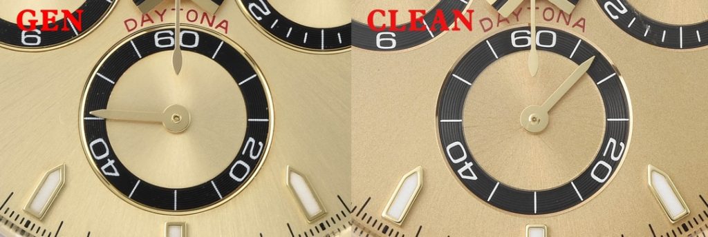 これらの異なる仕上げがひとつのサブダイヤルに集約されています。良品率は大幅に低下しましたが、Cleanファクトリーは純正品を分解し、このディテールを完璧に再現しました。