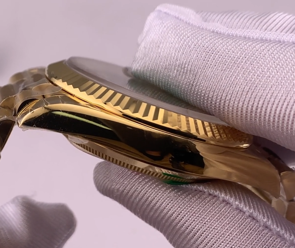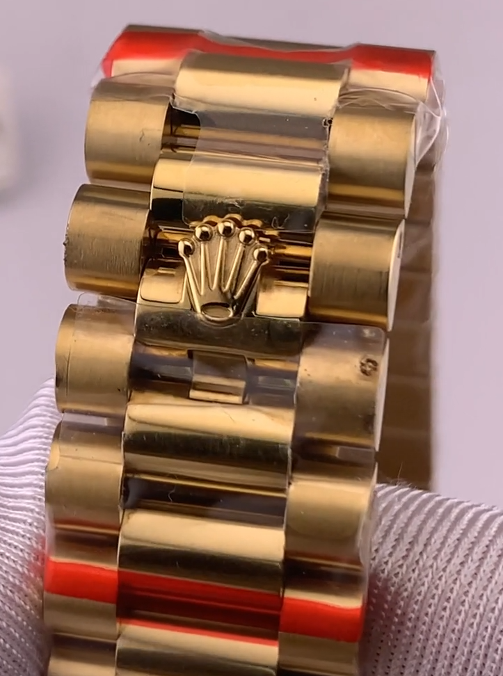 デイデイト専用の「プレジデントブレスレット」も妥協なく再現されています。駒の隙間が極限まで詰められており、手に持った時の剛性感と、手首に吸い付くような滑らかな装着感は感動的です。バックルの王冠マークの立体感も非の打ち所がありません。