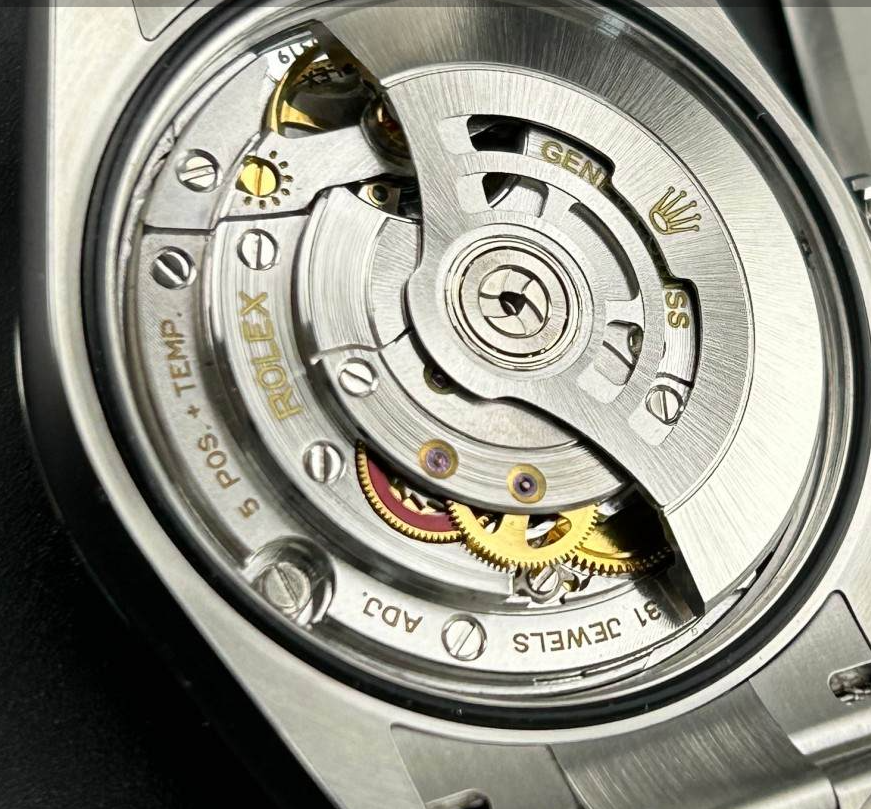 心臓部にはクローンCal.3230を搭載。精度も日常使いで十分満足できるレベルに調整済みです。CLEANファクトリーの職人たちは、ベゼルエッジのシャープさ、風防の透明度、インデックスと針の立体感、バックルのクリック感まで、本物に極めて近い再現を追求しています。特にピスタチオダイヤルのグラデーションと発色は、現行のハイエンドレプリカの中でも随一と評価されています。