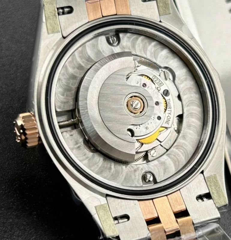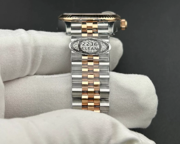 ケース径31mmは、日本女性の腕に自然にフィットするサイズ感です。大きすぎず小さすぎず、オフィスからカジュアルシーンまで幅広く対応可能。エバーローズゴールドの温かみのあるピンク調が、肌なじみが良く、アジア人の肌トーンに特にマッチします。CLEANファクトリーの再現技術により、ケースの仕上げやポリッシュ部分の質感が本物に極めて近く、耐久性と美しさを両立しています。