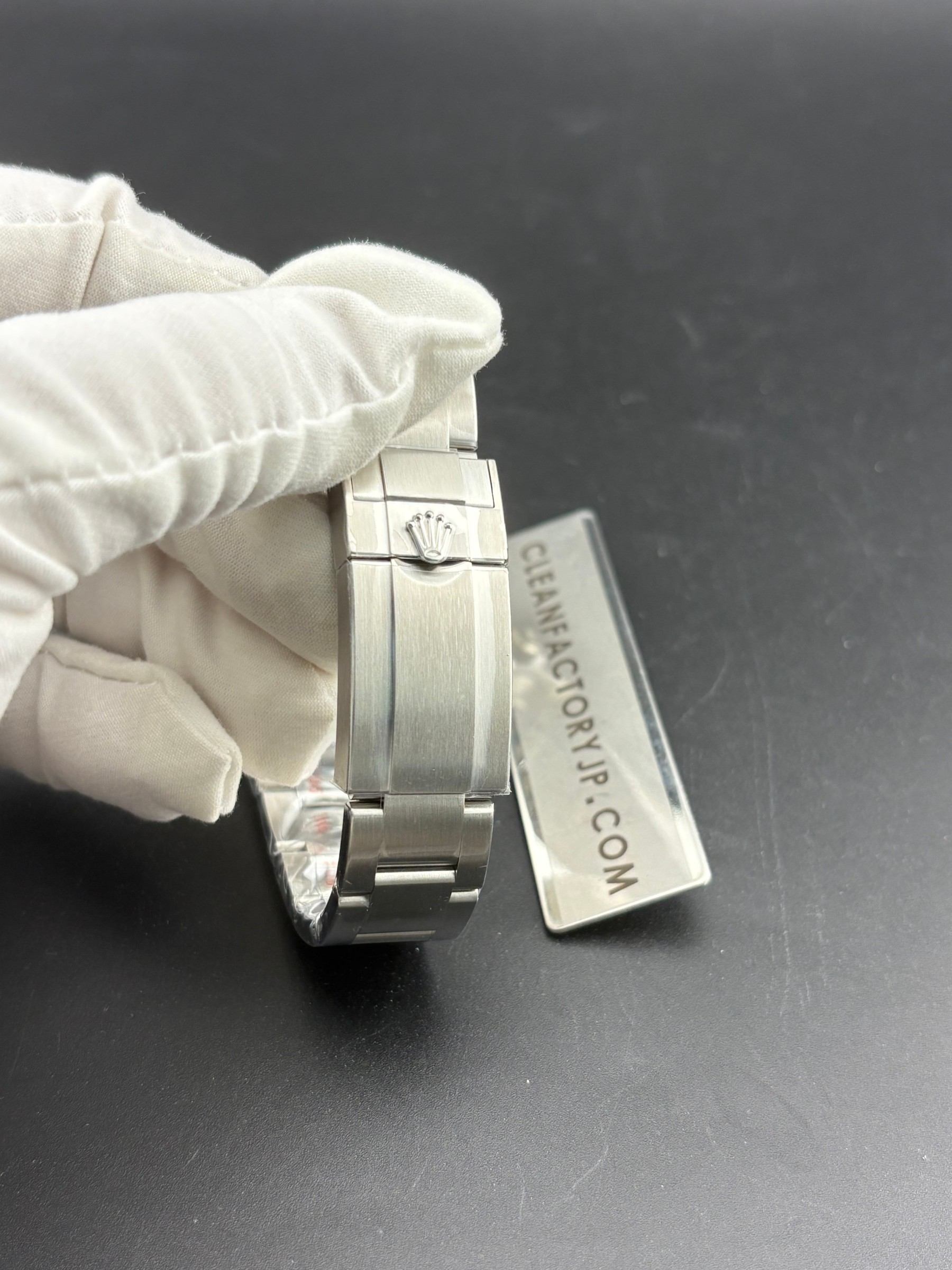 7:バックル:バックルもAR工場を採用し、王冠マークに立体感がはっきりし、位置が右左のどちらに偏りせずちょうど真ん中にあり、弧度や深さが正規品と同様、ほかの工場より何倍も精度高いです。折りたたみバックルが少しきつめにされており、重さを感じるがパチっとする音は明瞭です。バックルの王冠マークはバックルとスポット溶接ではなく一体成形です。