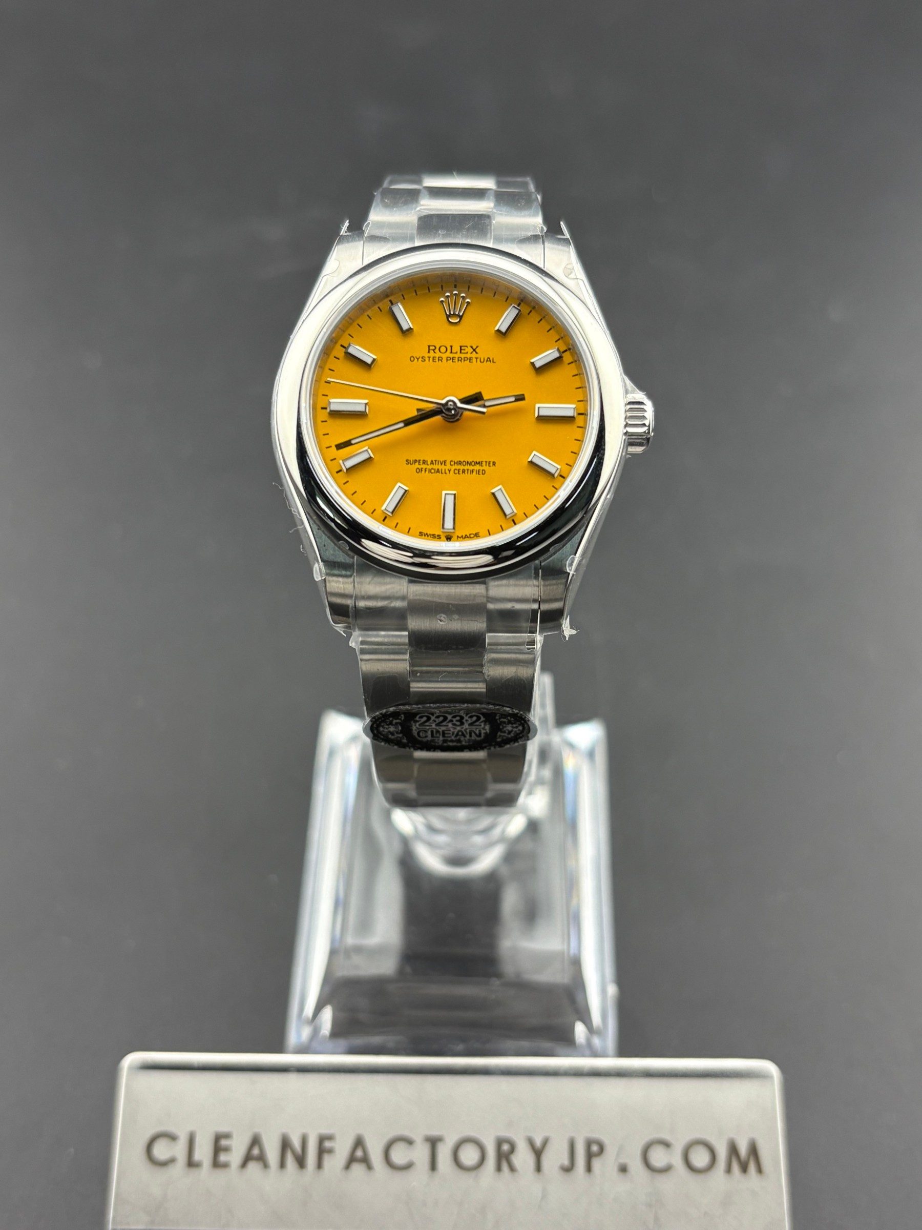 2:文字盤:オイスター パーペチュアル レディースコレクションのために作られたこのイエロー色は、ラッカーを使用している。ダイアルのベースとなる真鍮のプレートには合計6層のラッカーが重ねられ、均一な表面に仕上がる。その後さまざまな文字がパッドプリントされ、アワーマーカーとクラウンが手作業で固定される。目盛りには本物一緒のクロマライト夜光塗料が均一に塗られています。