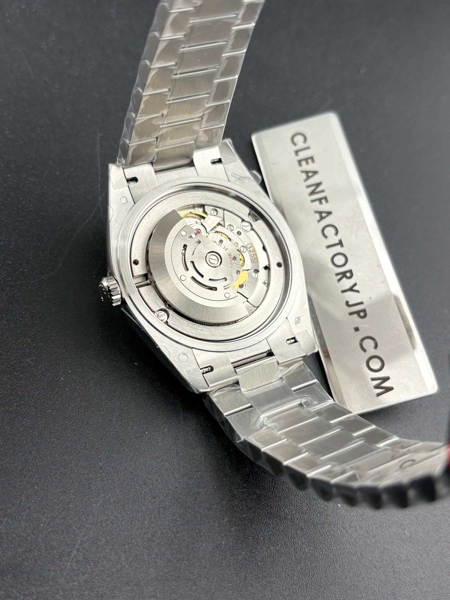 6:ケース:本物同様の904L高強度ステンレススチル素材を採用します。完全に分解された本物の時計サンプルを基に、高度なCAD/CAM、モジュラー金型、CNCレーザー加工機を使用して各パーツを複製しています。ケースの内側の刻字がはっきり見えて、時間表示の針はそれぞれの文字の位置に対応し、並びも綺麗で、文字盤と刻印のズレを避けています。フルーテッドベゼルはプラチナ素材を採用します。ベルトとケースの接着部分に関してはCLEAN工場は完璧にできています、一コマ目を少し下に重心が行くような効果を出し、接着面の上がる角度等は正規品と一致し、より本物に近づくように制作されているだけではなく、腕によりピッタリハマるというのも初心にしてます。