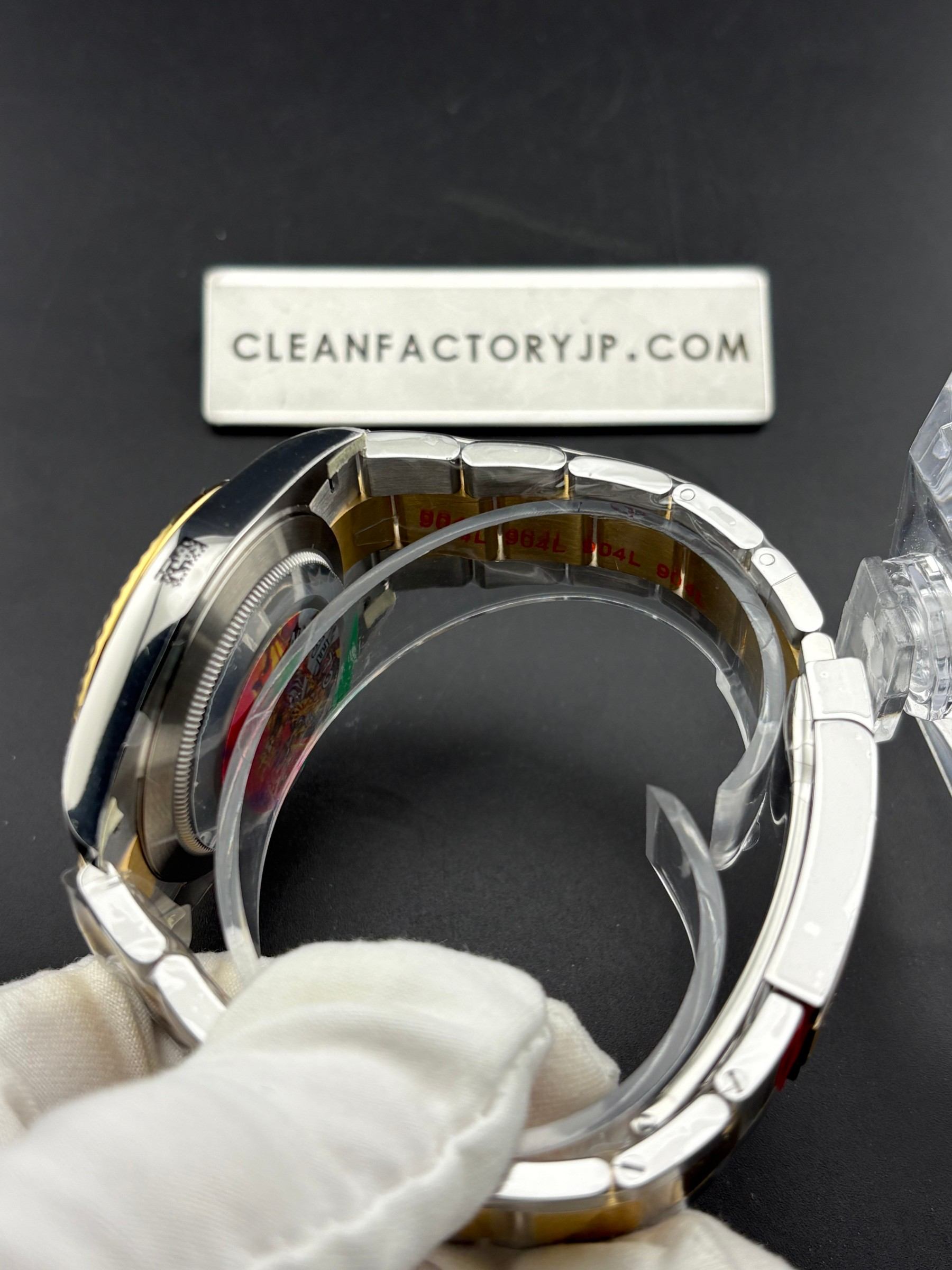 6:ケース:904L高強度ステンレススチル素材で18K IPG ゴールド特殊イオンコーティング。ケースの内側の刻字がはっきり見えて、時間表示の針はそれぞれの文字の位置に対応し、並びも綺麗で、文字盤と刻印のズレを避けています。ベルトとケースの接着部分に関してはCLEAN工場は完璧にできています、一コマ目を少し下に重心が行くような効果を出し、接着面の上がる角度等は正規品と一致し、より本物に近づくように制作されているだけではなく、腕によりピッタリハマるというのも初心にしてます。