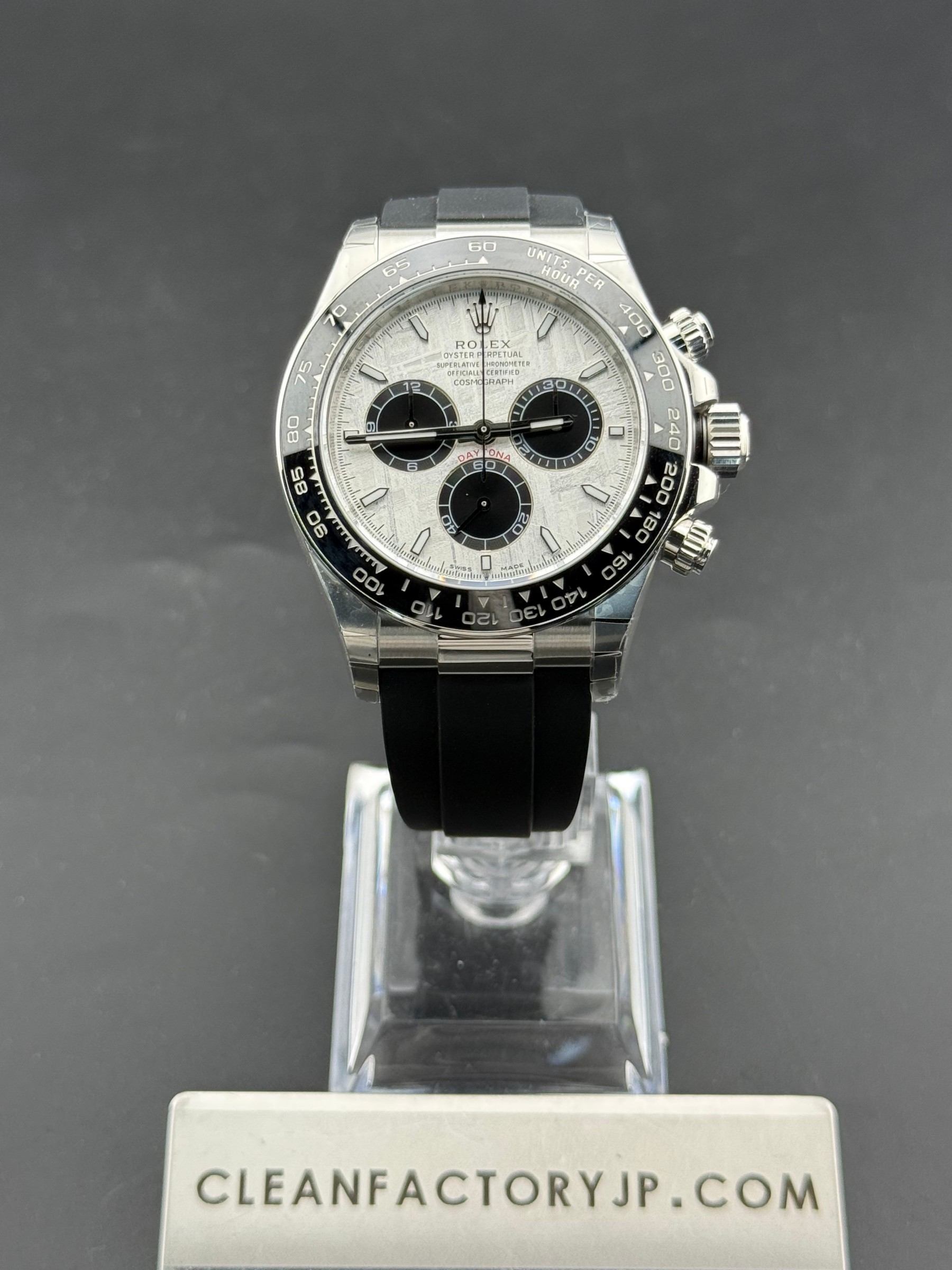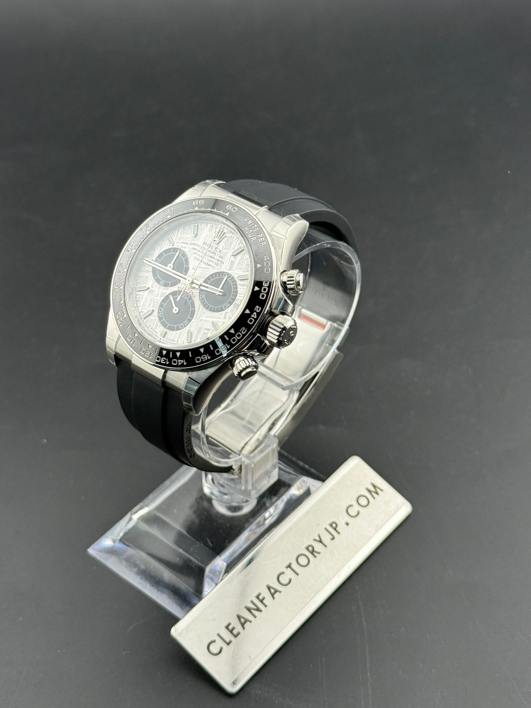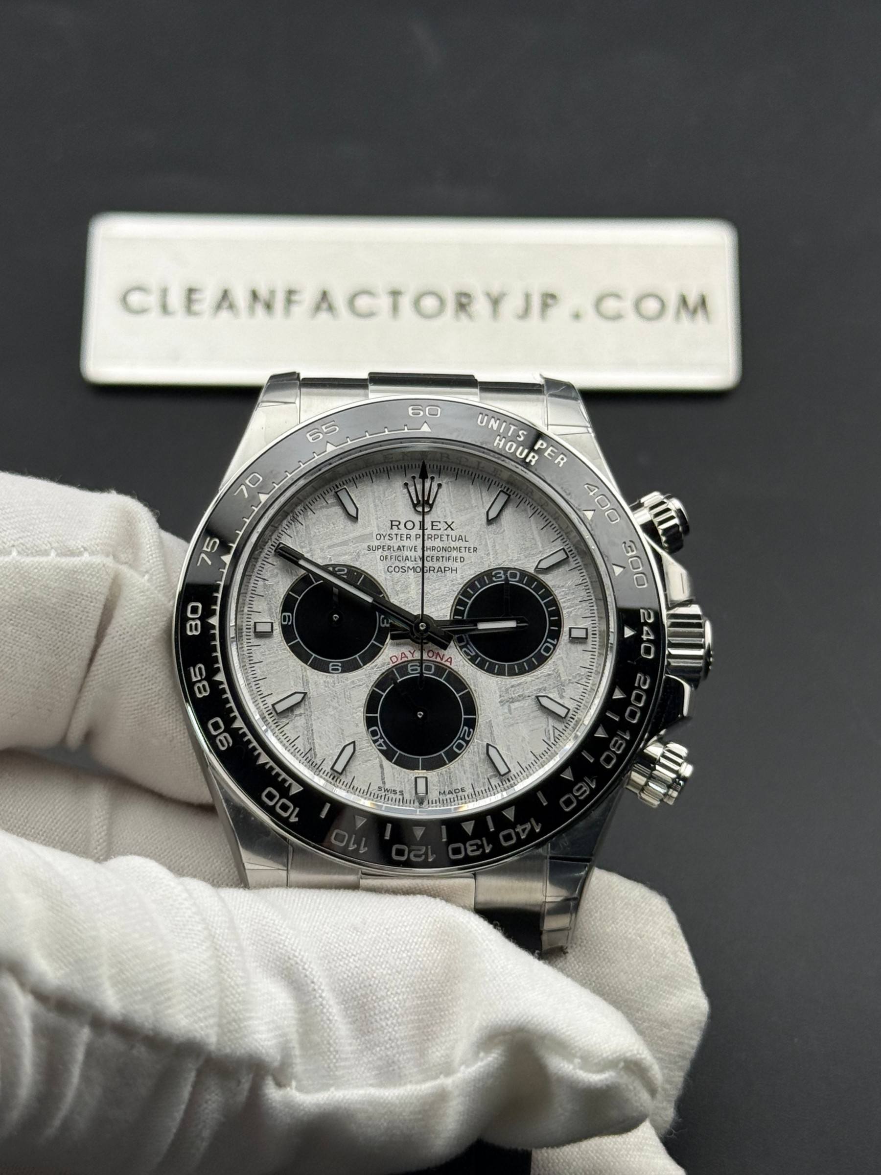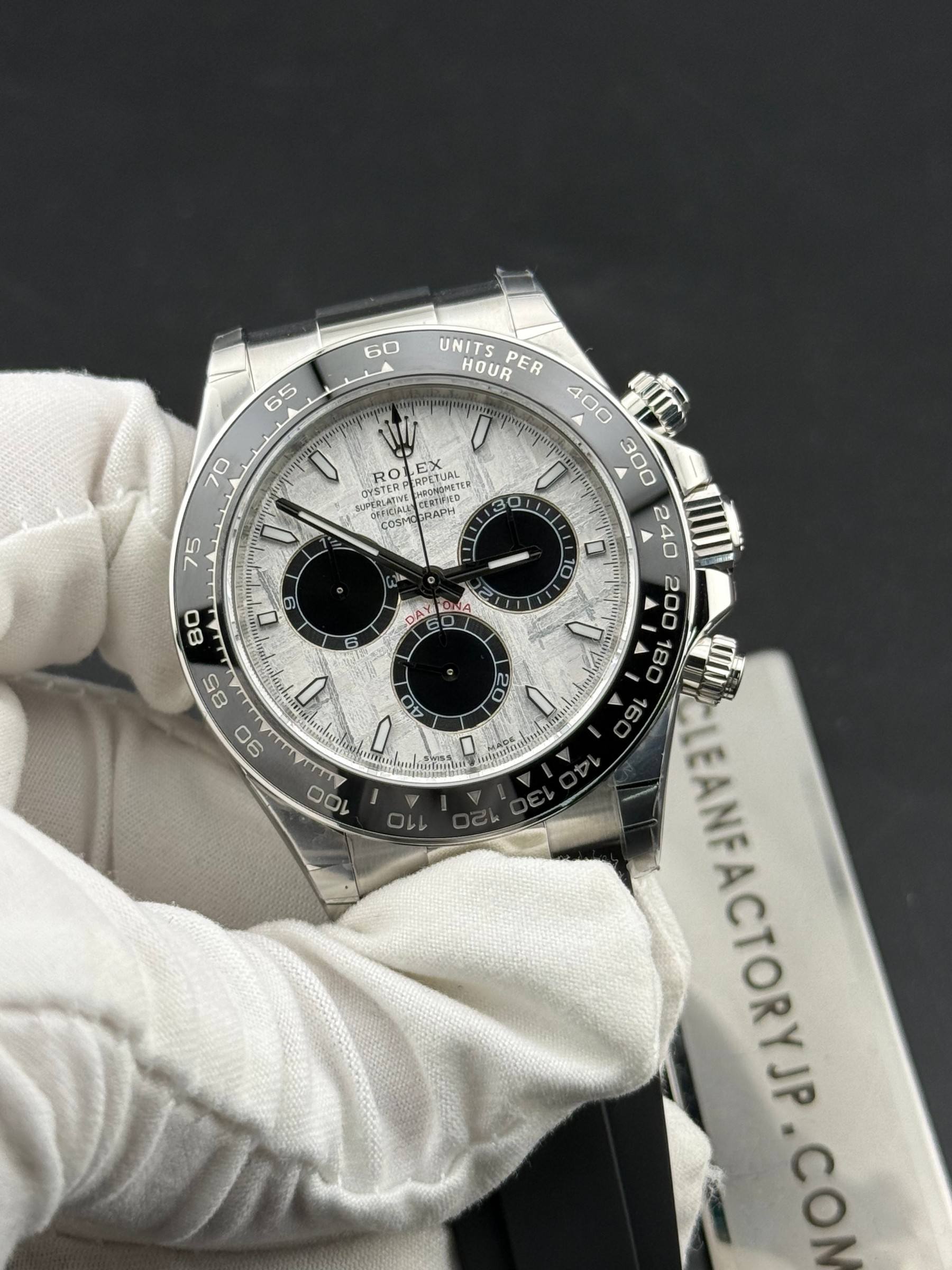 こちらは、隕石(メテオライト)ダイヤルを採用したロレックス コスモグラフ デイトナの最新モデルです。ダイヤル表面には、隕石特有のウィドマンシュテッテン構造と呼ばれる自然の結晶模様が現れており、ひとつひとつが世界に一つだけの模様を持ちます。CLEANクリーン工場はコストを惜しまず、ベゼル、風防、インナーカバー、文字、針、バックルは本物にも通用可能です。